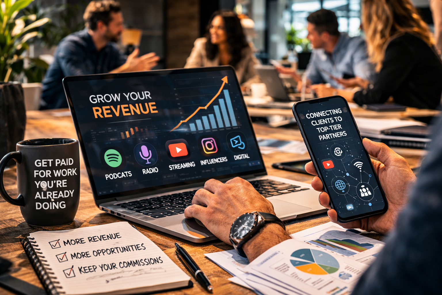 If your client is looking to expand their marketing into additional media channels - Podcasts, Radio, Streaming, YouTube Influencers, or Digital - We’ll first confirm that we’re not currently working with them and then facilitate the introduction.
